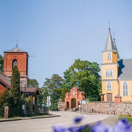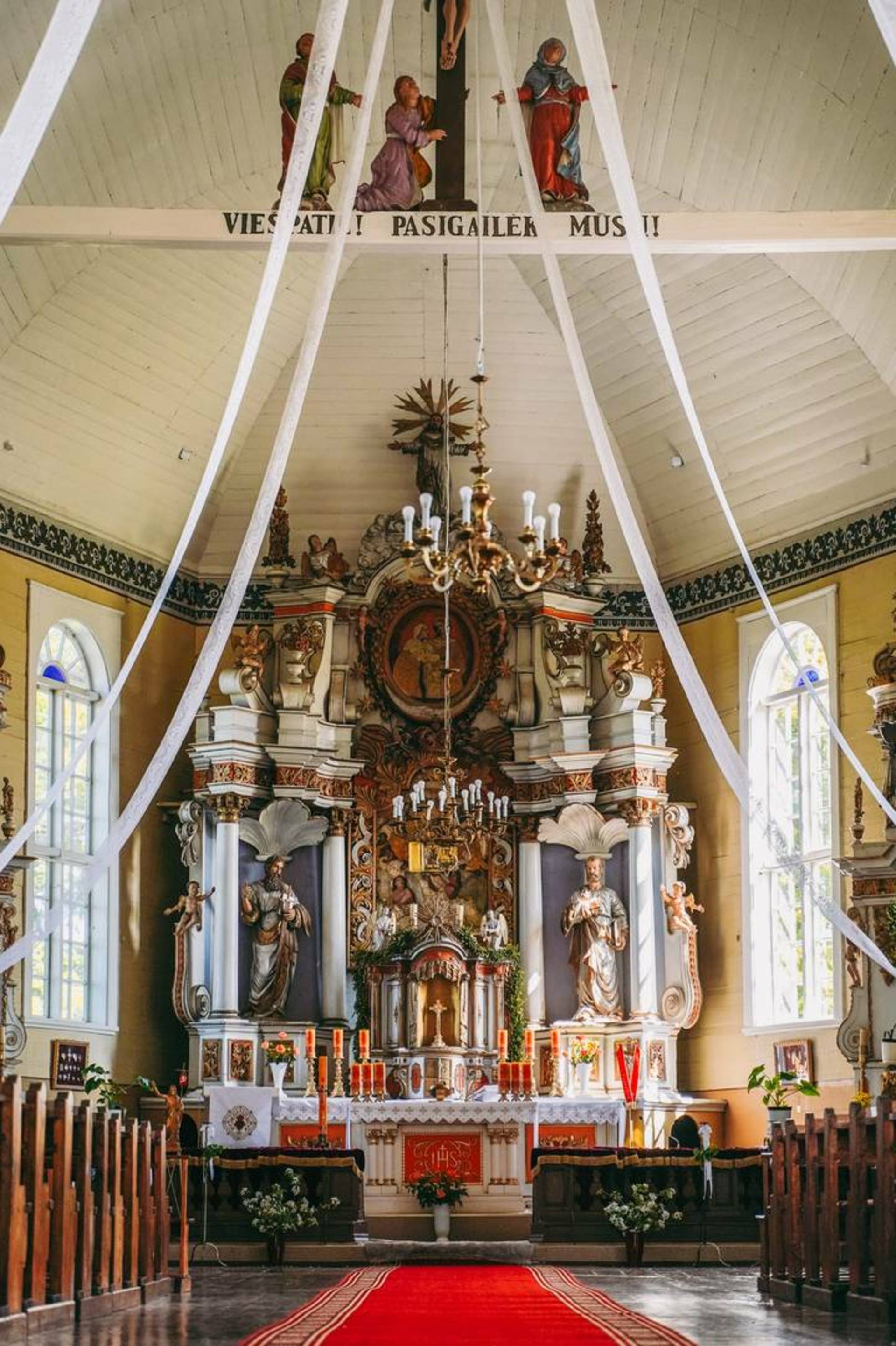 Bažnyčia pastatyta 1897 m. 1907 m. už bažnyčios šventoriaus pastatyta medinė varpinė – didžiausia Lietuvoje. Šventoriuje įrengta 14 raudonų plytų koplytėlių su Kryžiaus kelių stacijomis. Šventoriaus vartai – žemaitiškojo baroko stiliaus, kurie Lietuvoje yra tokie vieninteliai. Vartuose išlikę unikalių įrašų, vartų steigėjų pavardės. Bažnyčios interjerą puošia: altorėlis su skulptūromis, šventųjų paveikslai. Šventoriuje yra dvi medinės koplytėlės, kurios įtrauktos į Kultūros registro sąrašą.